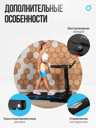 Для дополнительного удобства MANGAN A оснащена подставкой для планшета или смартфона и разъемом USB, который поддерживает зарядку мобильных устройств. Также предусмотрена беспроводная зарядка для смартфонов, что позволит вам оставаться на связи и не беспокоиться о разряженном аккумуляторе. Управление скоростью и уровнем наклона находится прямо на поручнях, что упрощает регулировку настроек во время тренировки.