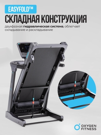 OXYGEN FITNESS COBALT LCD PRO не только высокотехнологична, но и удобна в использовании. Сенсорные датчики на поручнях точно измеряют ваш пульс, а беспроводной приемник HRC поддерживает работу с кардиодатчиками, которые можно приобрести отдельно для еще большей точности. Встроенные транспортировочные ролики и компенсаторы неровностей пола обеспечат простоту перемещения и установки дорожки в любом месте вашего дома или фитнес-зала. Складная конструкция с двухфазной гидравлической системой easyFOLD™ делает хранение дорожки максимально удобным. В сложенном виде она занимает всего 128 см в длину, 89 см в ширину и 160 см в высоту, что позволит вам экономить пространство, не жертвуя качеством тренировок.