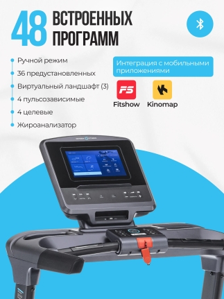 • интеграция с мобильными приложениями Fitshow™ и Kinomap™ через Bluetooth; • 10-дюймовый TFT дисплей; • 48 встроенных программ тренировок;